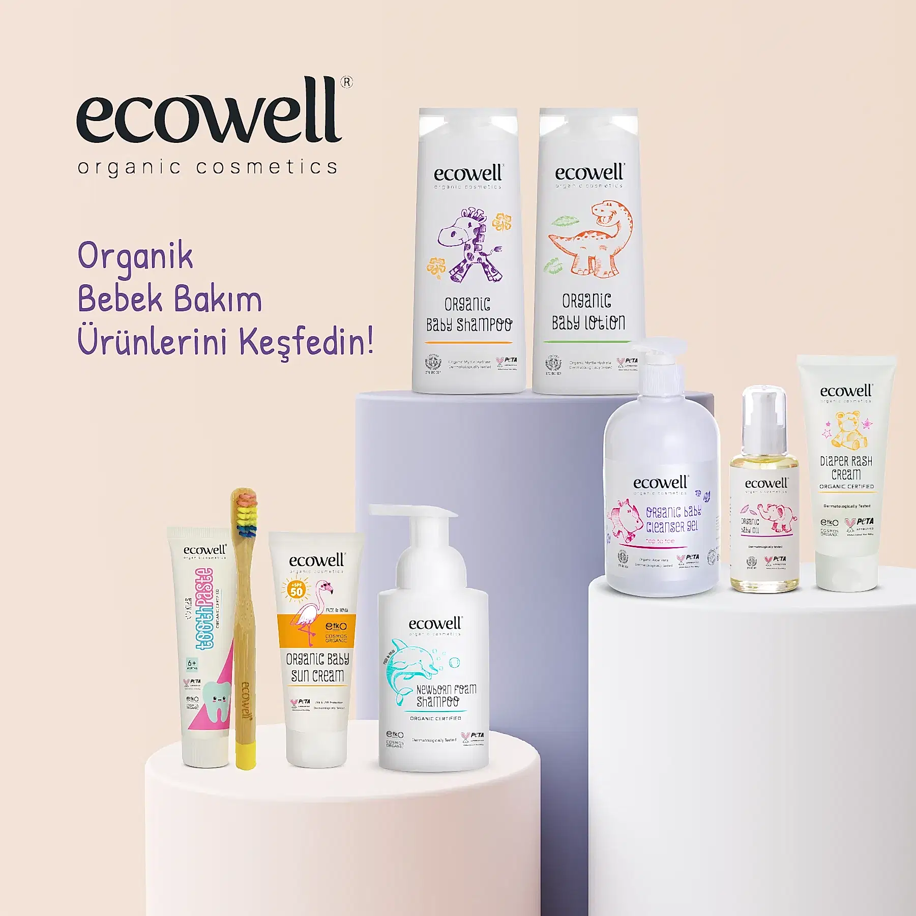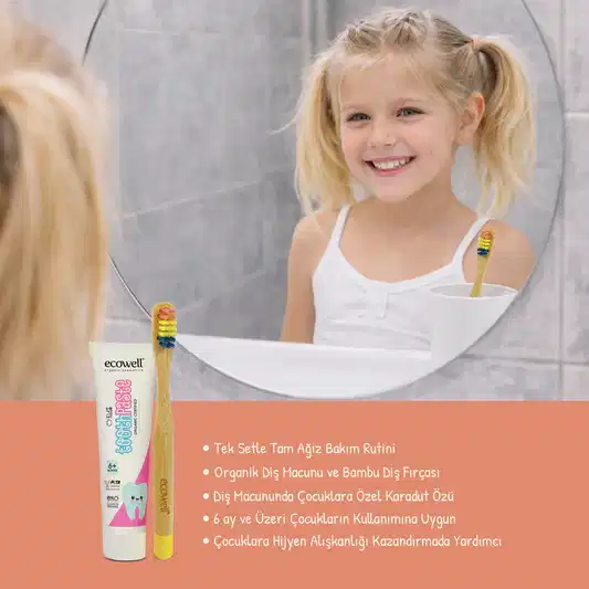 ECOWELL ORGANİK FLORÜRSÜZ ÇOCUK DİŞ MACUNU (35 GR) Cosmos Organik Sertifikalı Ecowell Çocuk Diş Macunu, çocuğunuzun süt ve daimî dişleri için özel olarak formüle edilmiştir. İçeriğinde bulunan Organik Aloe Vera dişlerin temizlenmesine ve korunmasına yardımcı olurken, Organik Karadut çocuğunuzun keyifle ve güvenle diş fırçalamasını yardımcı olacaktır. 6 aylık ve üzeri çocukların ve yetişkinlerin kullanımına uygundur. Kullanım Şekli: Diş fırçasının kıllarını az miktarda suyla ıslatın. Tüpü hafif sıkarak bezelye büyüklüğünde bir diş macununu diş fırçasına alın. Diş fırçasını küçük dairesel veya ileri-geri hareketlerle hafifçe hareket ettirerek dişleri fırçalayın. Fırçalama bittikten sonra diş macununu tükürün ve ağzınızı temiz su ile çalkalayın. Dişlerin günde 2 kez 2 dakika fırçalanması önerilmektedir. İçerik Listesi: Glycerin, Hydrated Silica, Aqua, Aloe Barbadensis Leaf Juice*, Cocamidopropyl Betaine, Morus Nigra Fruit Extract, Camellia Sinensis Leaf Extract, Sodium Benzoate, Stevia Rebaudiana Extract, Carrageenan, Potassium Sorbate, Citric Acid. (* Content from Organic Farming) 12,00 % Organic Content, 98,95 % Natural Content. ECOWELL BAMBU ÇOCUK DİŞ FIRÇASI Ecowell Bambu Çocuk Diş Fırçası, çocukların ağız bakımı için en nazik ve çevre dostu seçenektir. FSC sertifikalı bambu sapı, plastik kullanımını azaltarak çevreye olan etkimizi düşürmeye yardımcı olur. Diş fırçasının ergonomik tasarımı, küçük eller için idealdir ve her kullanımda rahat bir tutuş sağlar. Ecowell Bambu Çocuk Diş Fırçası'nın kılları, özellikle çocukların hassas diş etleri düşünülerek yumuşak olarak tasarlanmıştır. Bu sayede etkili bir temizlik sağlanırken diş etlerine zarar verilmez. BPA içermeyen malzemelerle üretilen, çocuklarınız için güvenli ve hipoalerjenik bir seçimdir. Ayrıca, diş fırçasının renkli tasarımı çocukların ilgisini çekerek diş fırçalama alışkanlıklarını geliştirmelerine yardımcı olur. Ecowell Bambu Çocuk Diş Fırçası ile çocuklarınıza hem sağlıklı bir gülümseme hem de yeşil bir gelecek hediye edin.