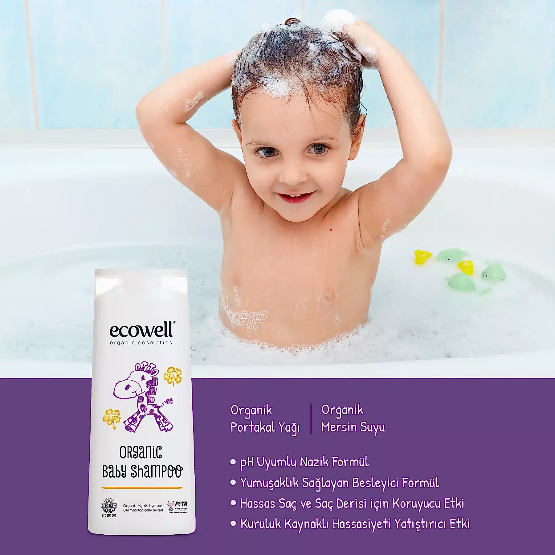 Ecowell Organik Bebek ve Çocuk Şampuanı, bebeğinizin hassas saç ve cildi için özel olarak geliştirilmiştir. ICEA (İtalyan sertifikalandırma enstitüsü) onaylı, vegan ve cruelty-free (hayvanlar üzerinde test edilmemiş) sertifikalı bu şampuan; organik portakal yağı ve mersin suyu içeriğiyle bebeğinizin cildini ve saçını temizlerken bakımını yapar.