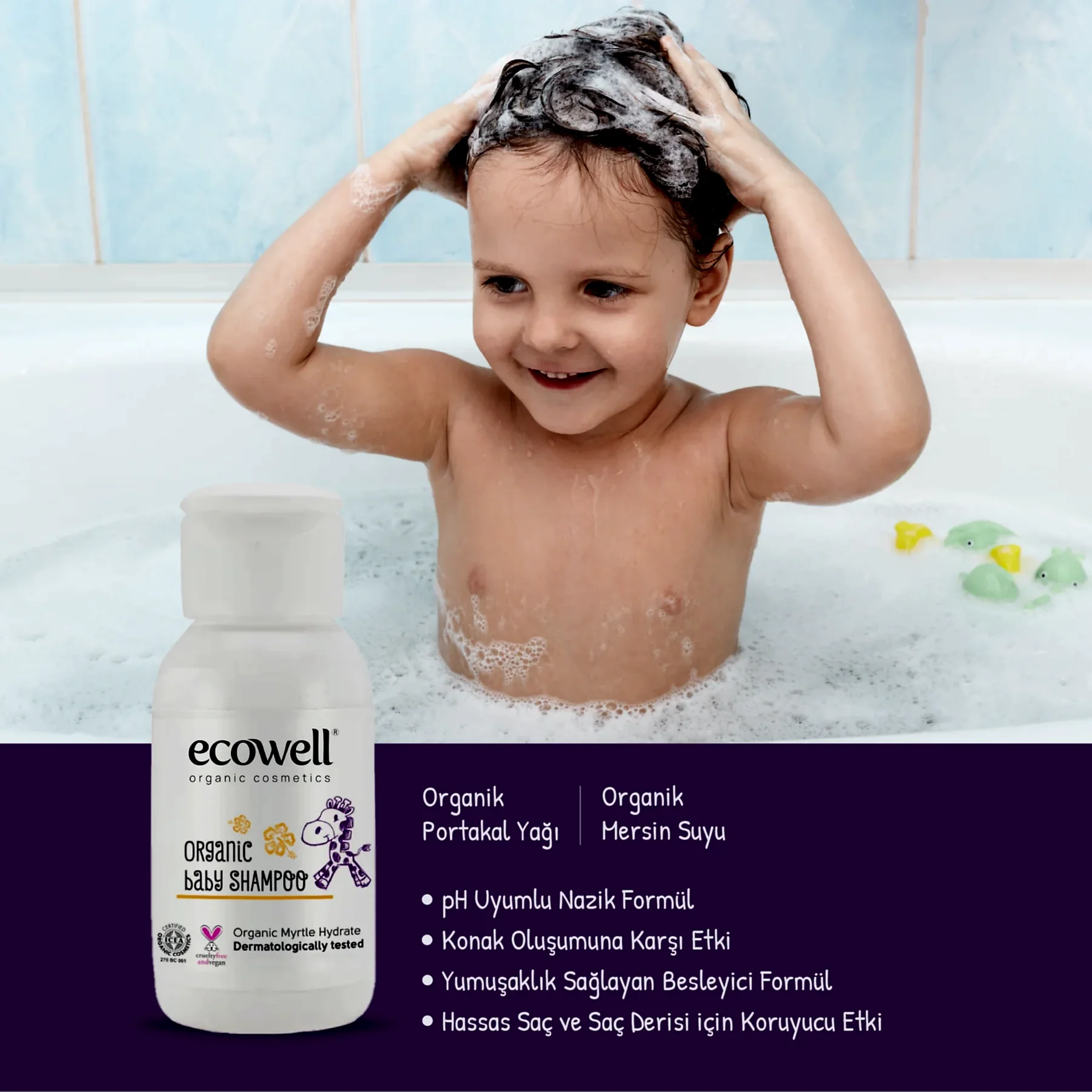 Ecowell Organik Bebek Şampuanı bebeğinizin hassas cildini ve saçını koruyan bitkisel içeriği ilk yıkamada etkisini hissettirir. İçeriğindeki Organik Portakal Yağı ve Mersin Suyu ile bebeğinizin saçlarını ve cildini tahriş etmeden nazikçe temizler. Bebeğinizin saçını besleyerek, yumuşacık olmasını sağlar. Konak oluşumunu engellemeye yardımcı olur. pH değeri bebeğinizin cildi ile uyumludur.