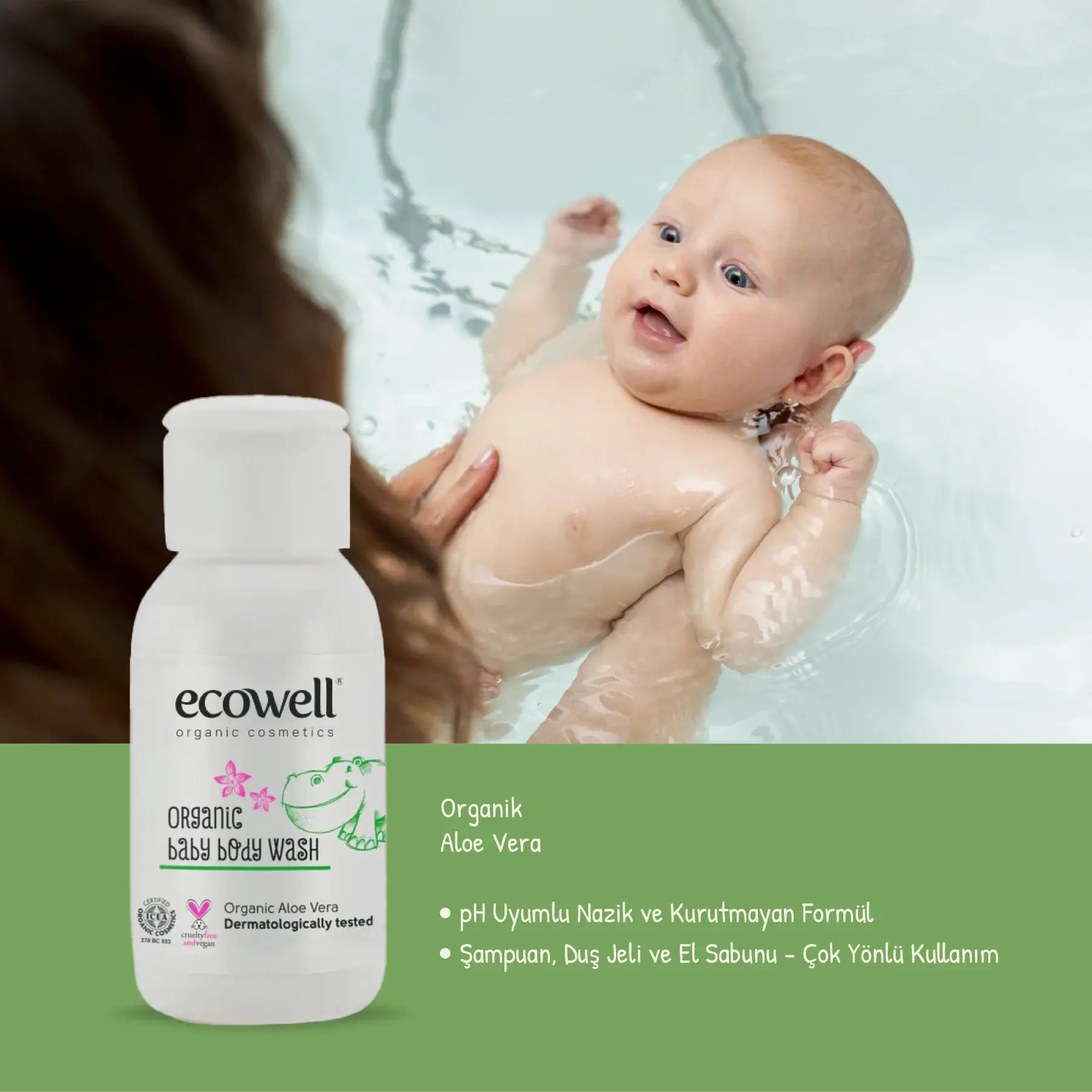 Bebeğinizin narin cildine özel olarak, organik sertifikalı ve doğal bileşenlerden üretilmiştir. Organik Aloe Vera içeren özel formülü sayesinde bebeğin cildine zarar vermeden ve kurutmadan temizler. Şampuan, duş jeli ve sıvı el sabunu olarak kullanıma uygundur. pH değeri bebeğin cildi ile uyumludur.