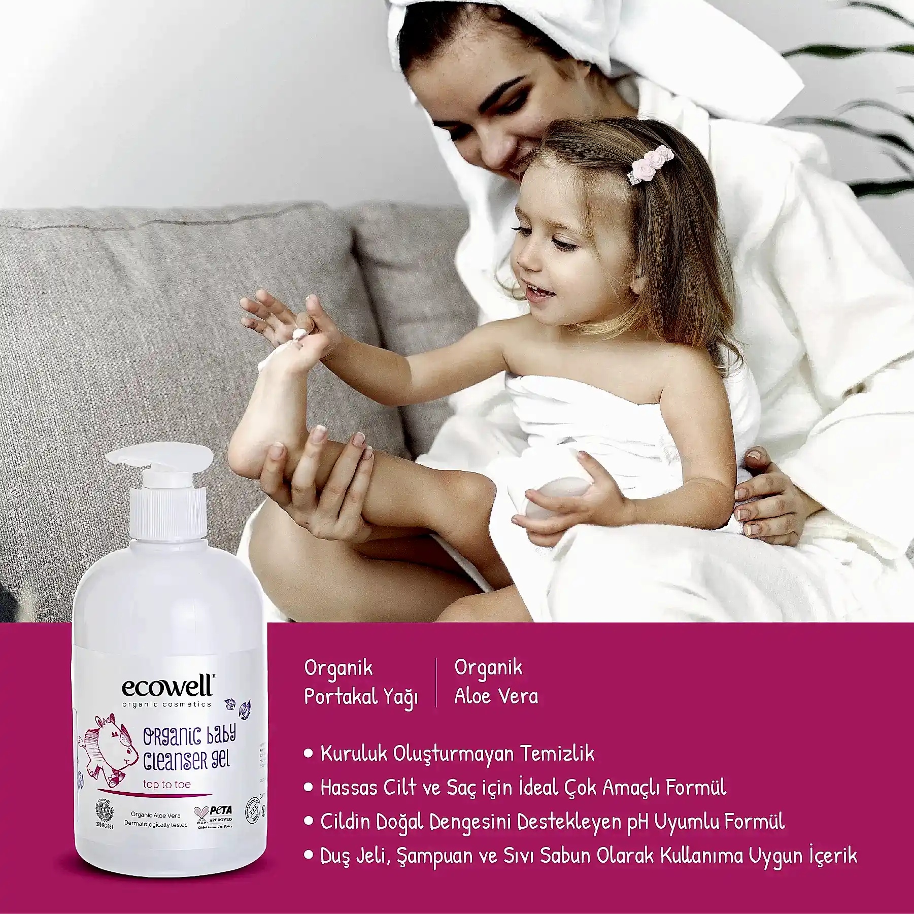 Bebeğinizin narin cildine özel olarak, organik sertifikalı ve doğal bileşenlerden üretilmiştir. Organik Aloe Vera içeren özel formülü sayesinde bebeğin cildine zarar vermeden ve kurutmadan temizler. Şampuan, duş jeli ve sıvı el sabunu olarak kullanıma uygundur. pH değeri bebeğin cildi ile uyumludur.