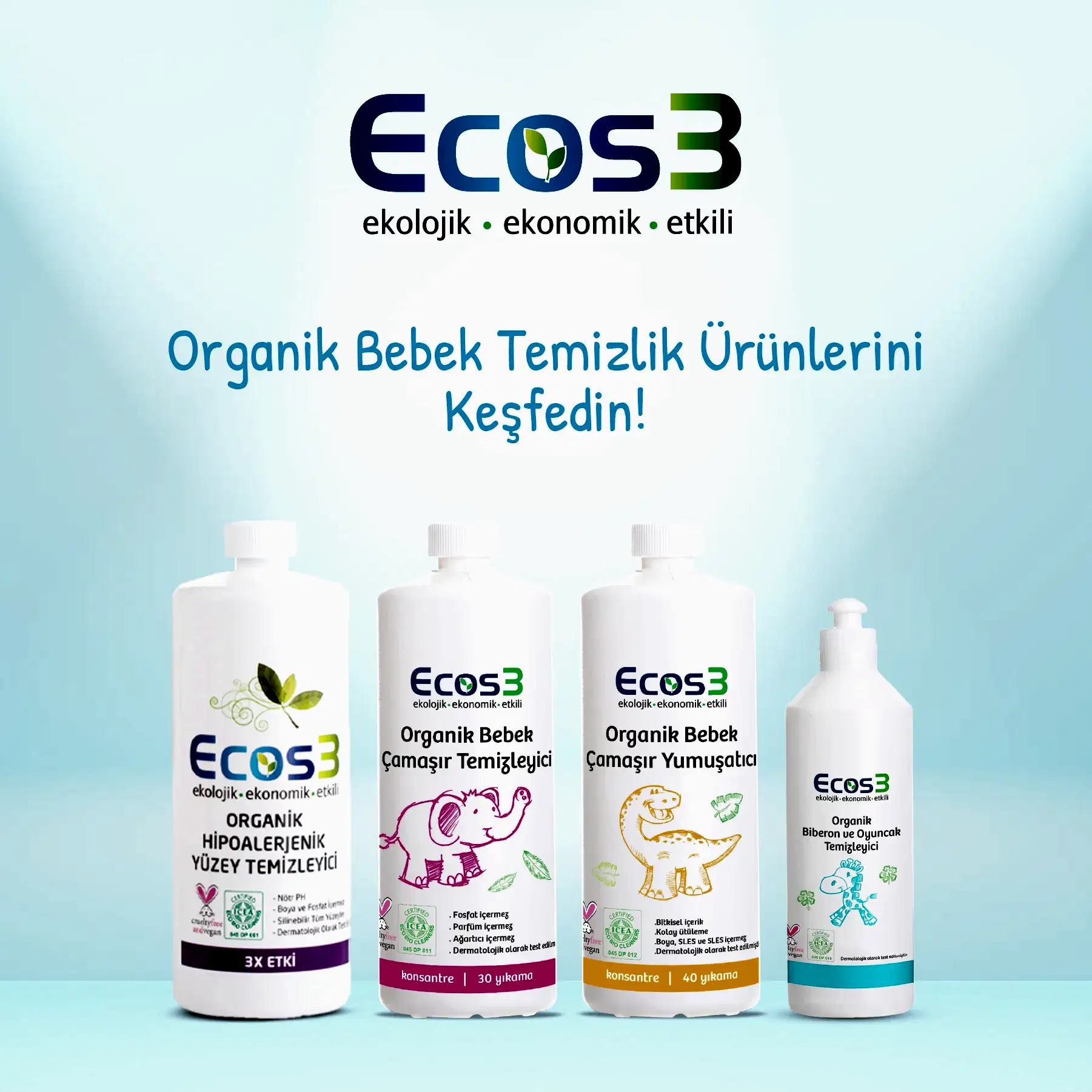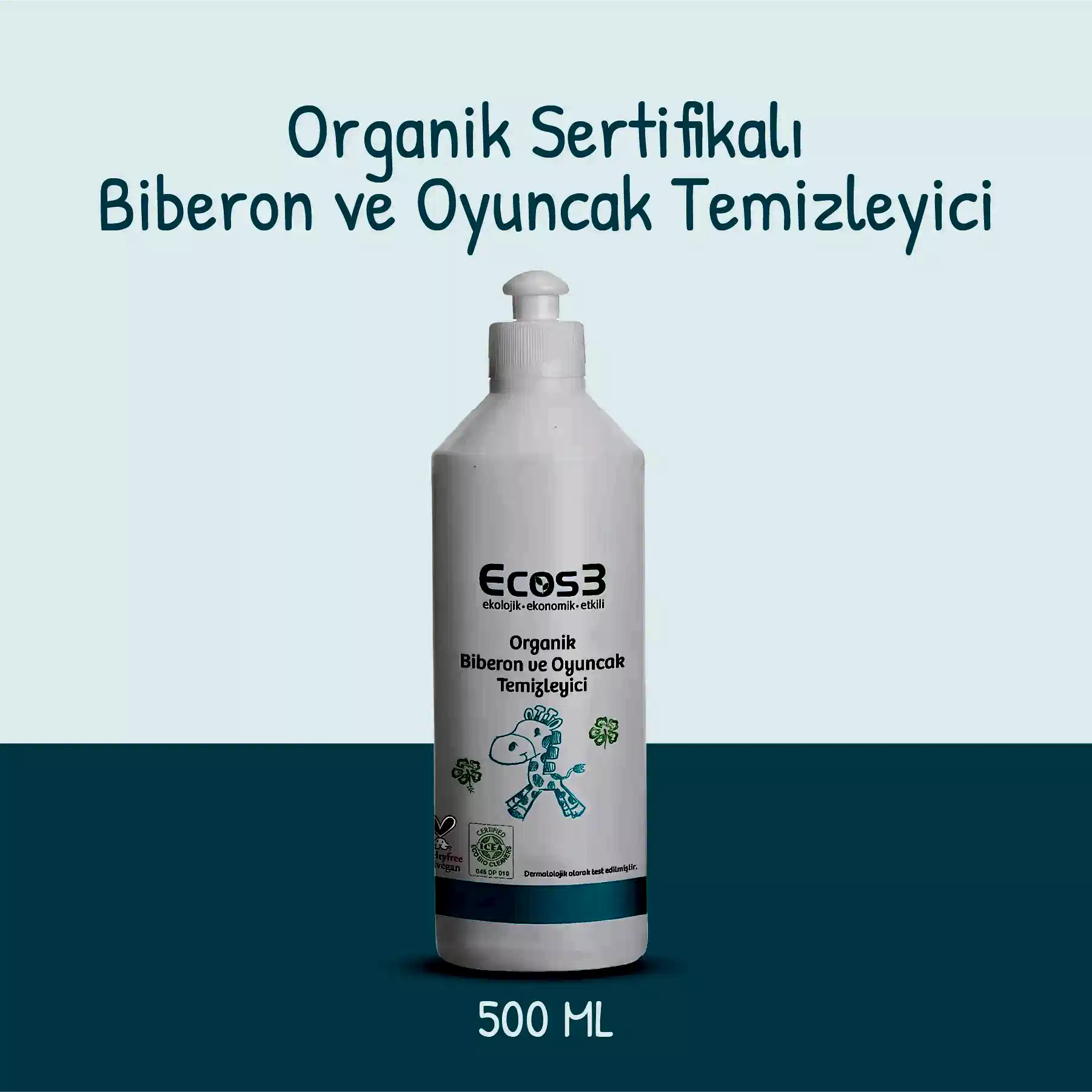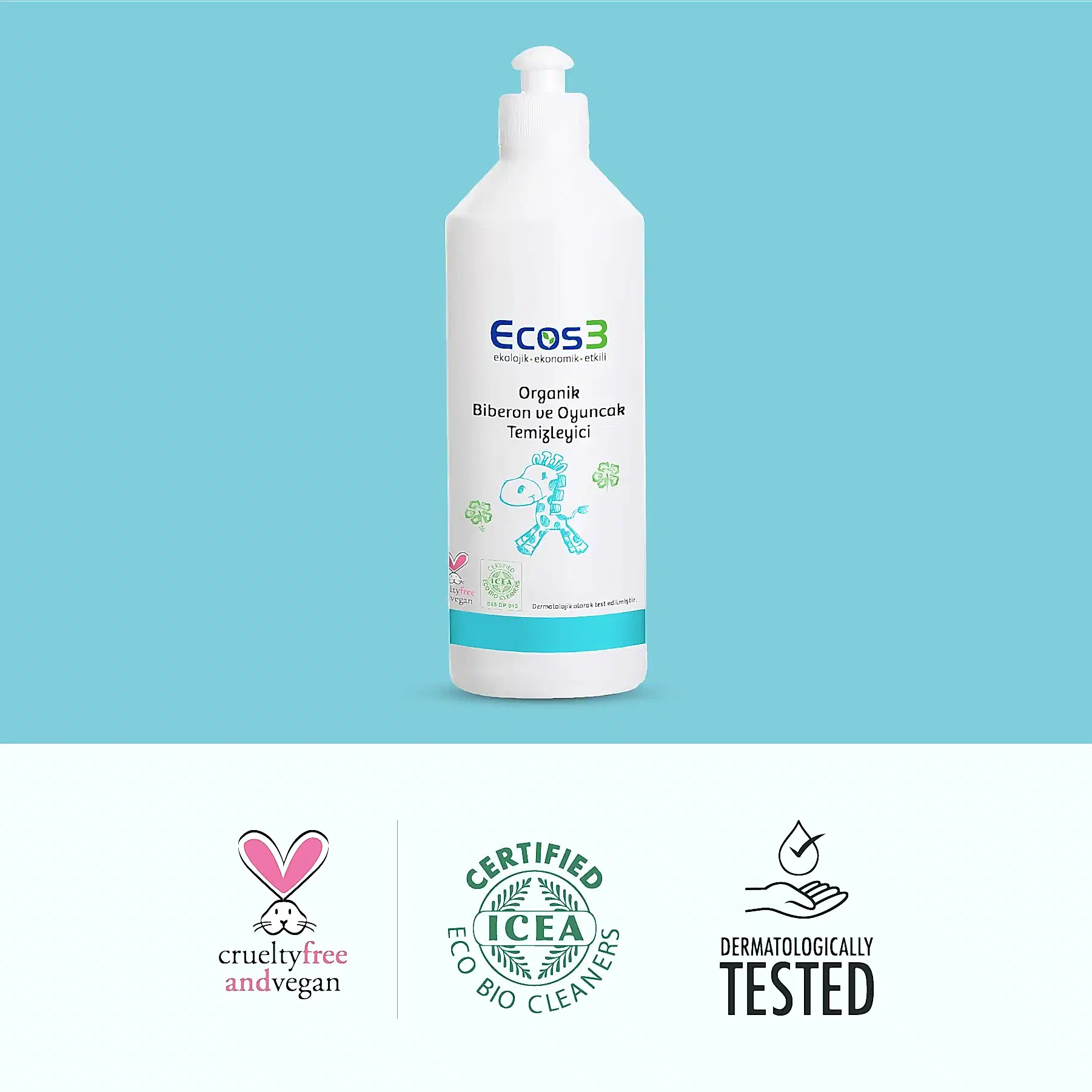 Ecos3 Organik Biberon ve Oyuncak Temizleyici, bebeğinizin günlük olarak temas ettiği biberon, emzik, göğüs pompası ve oyuncaklar için özel olarak geliştirilmiştir. İçeriğindeki organik bileşenler, güvenli ve etkili bir temizlik sağlamaya yardımcı olur.