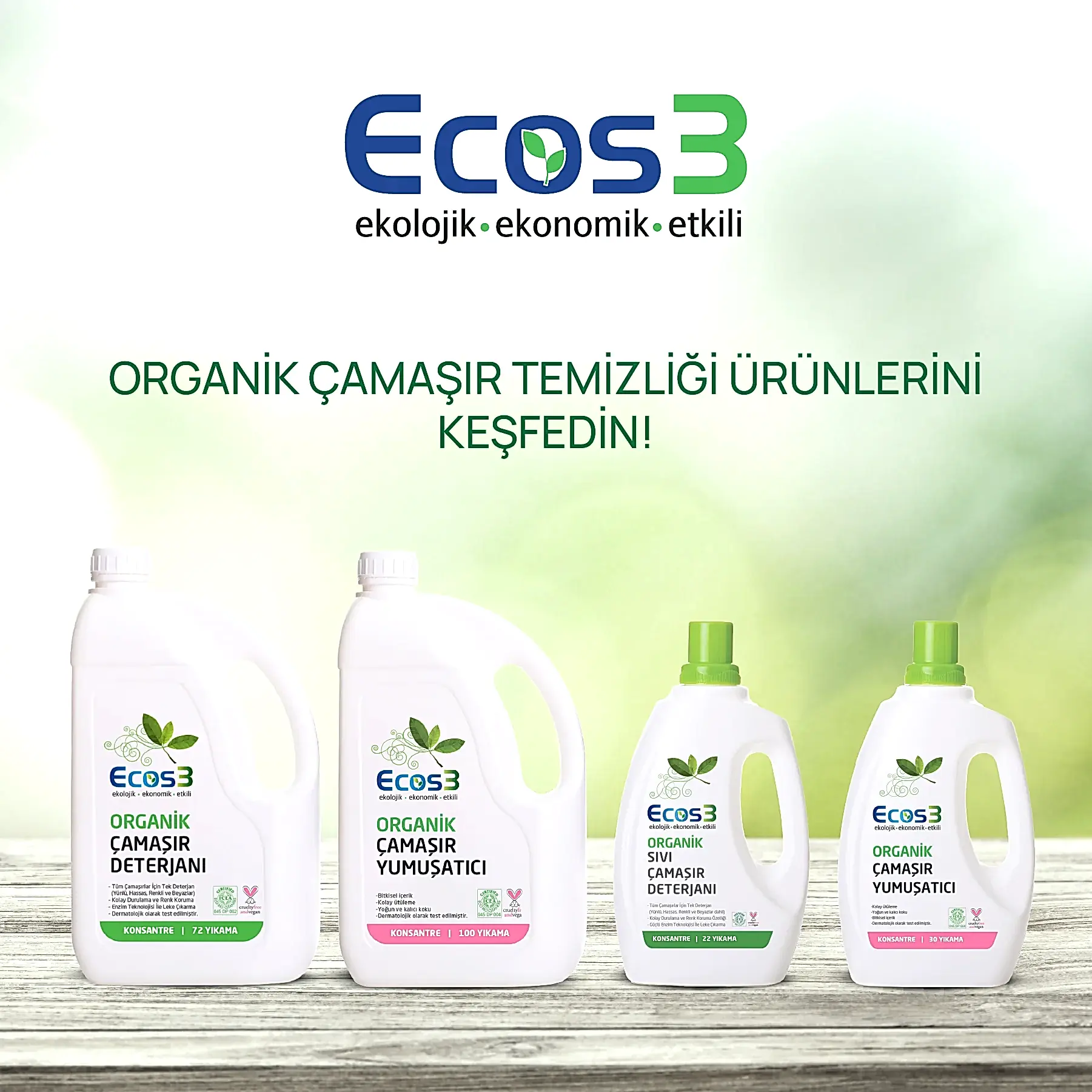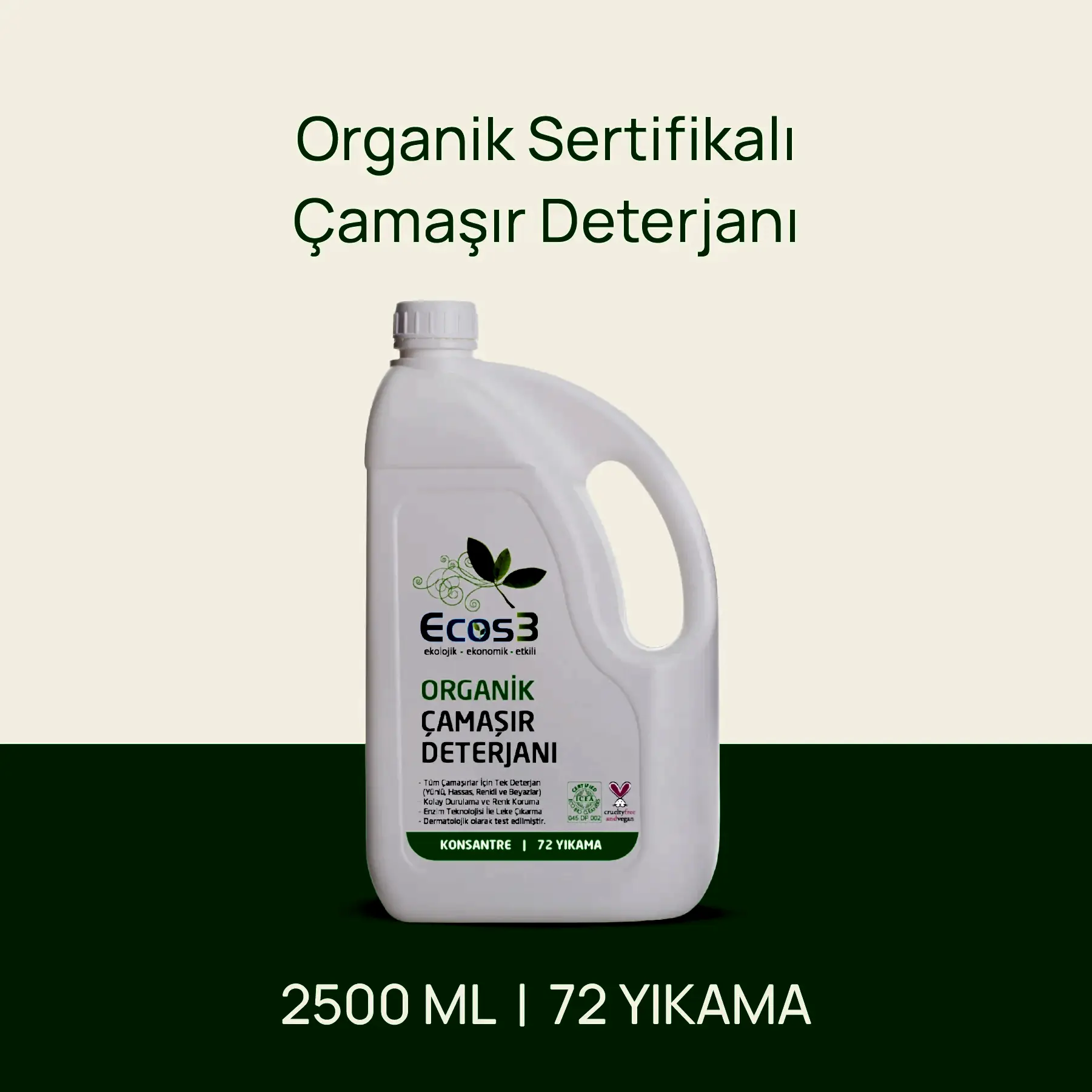 Ecos3 Sertifikalı Organik Çamaşır Deterjanı, 2,5 litrelik konsantre formülü sayesinde çoklu yıkama imkânı sunar. Güçlü enzim teknolojisi ile kir ve lekelerin etkili şekilde temizlenmesine yardımcı olurken, düşük sıcaklıklarda dahi yüksek performans göstererek enerji tasarrufunu destekler.