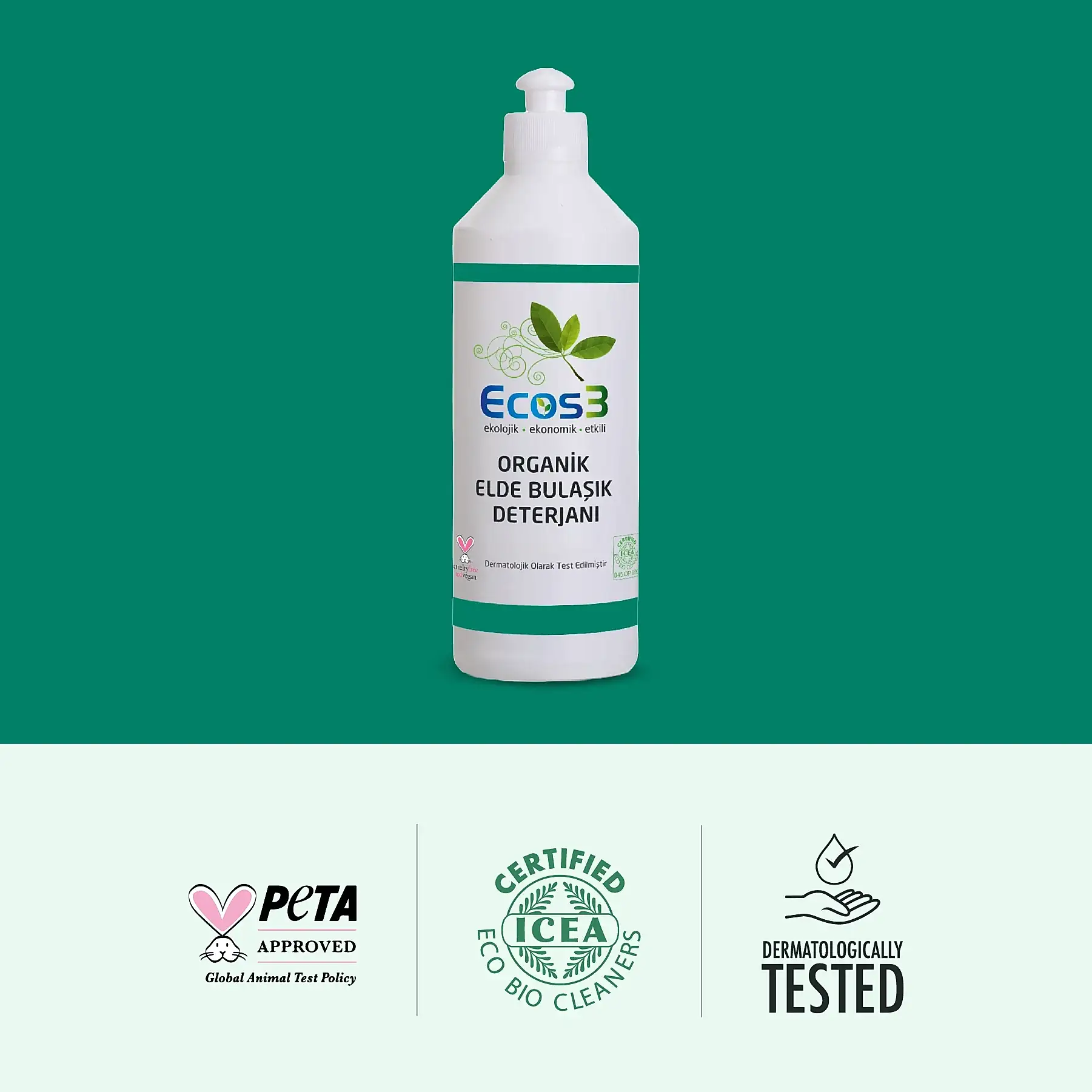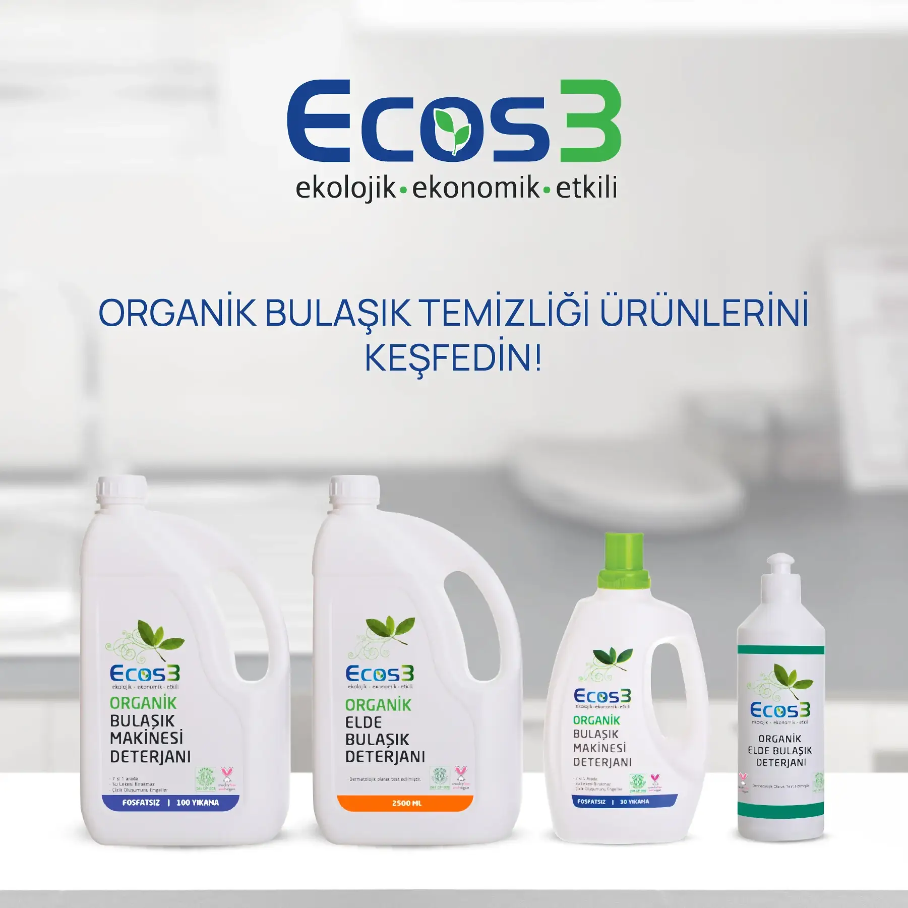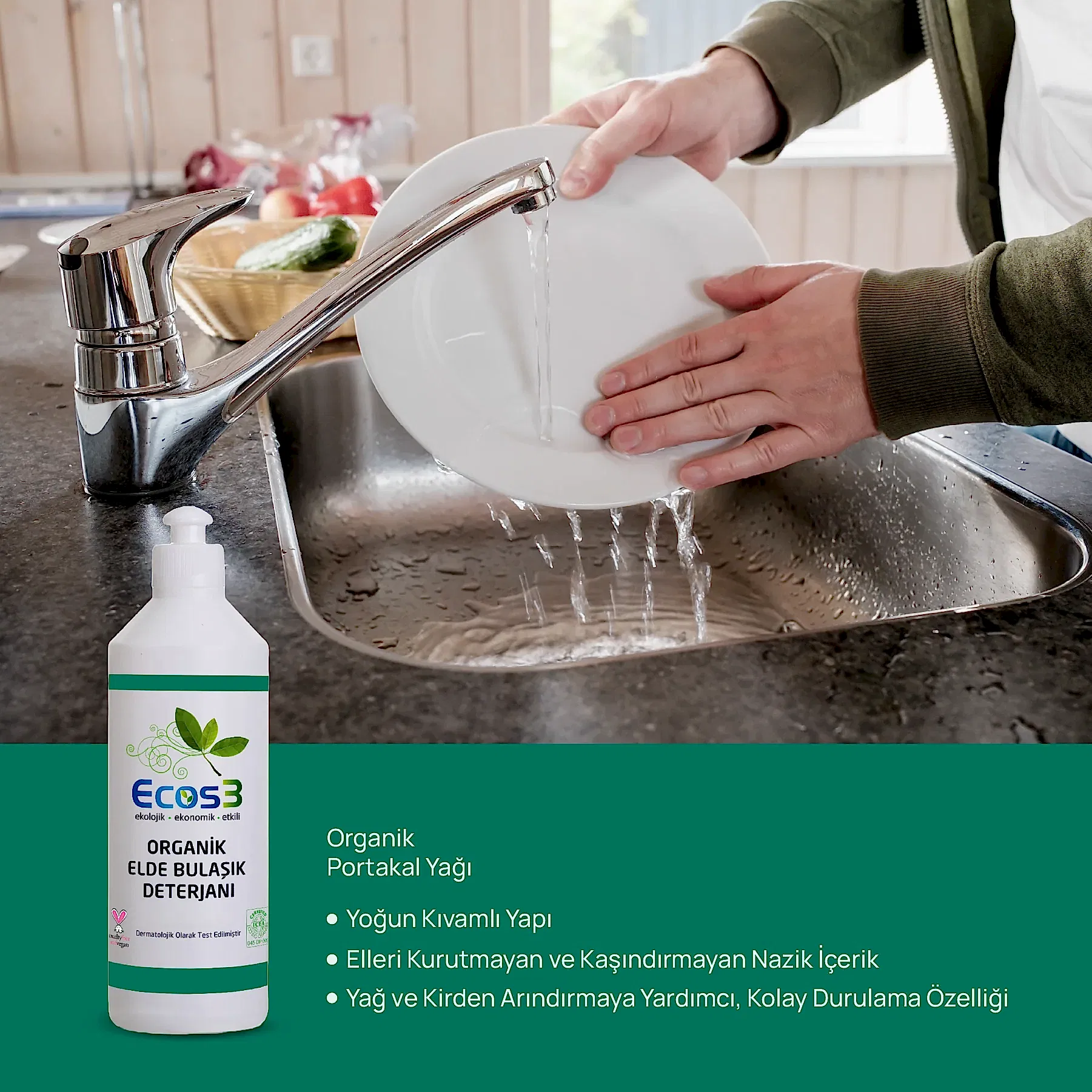 Ecos3 Organik Elde Bulaşık Deterjanı, elde bulaşık yıkama için geliştirilmiş etkili ve kolay durulanan bir formüle sahiptir. Yağ ve kirlerin çözülmesine yardımcı olarak bulaşıkların temizlenmesini sağlar ve durulama sonrası kalıntı bırakmaz.