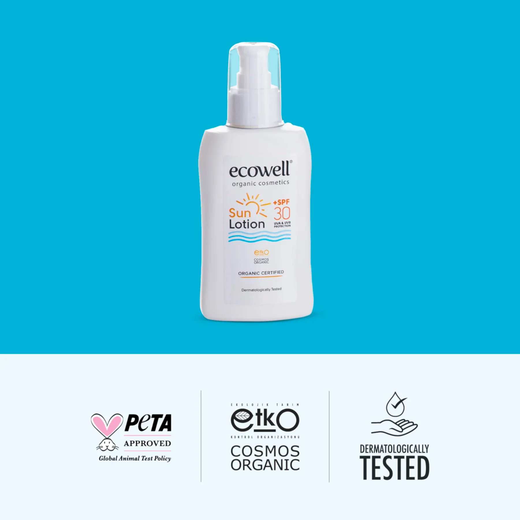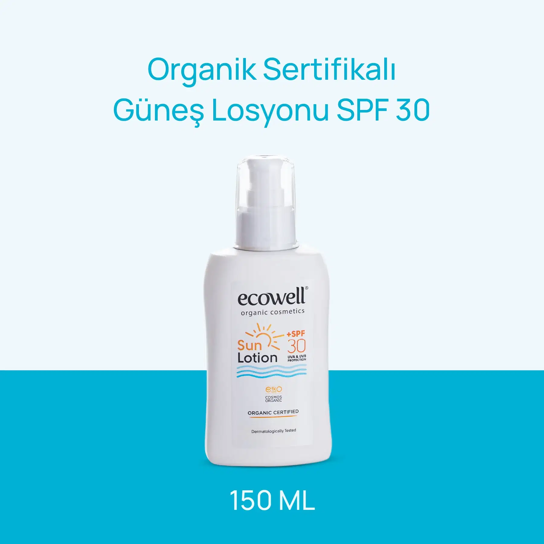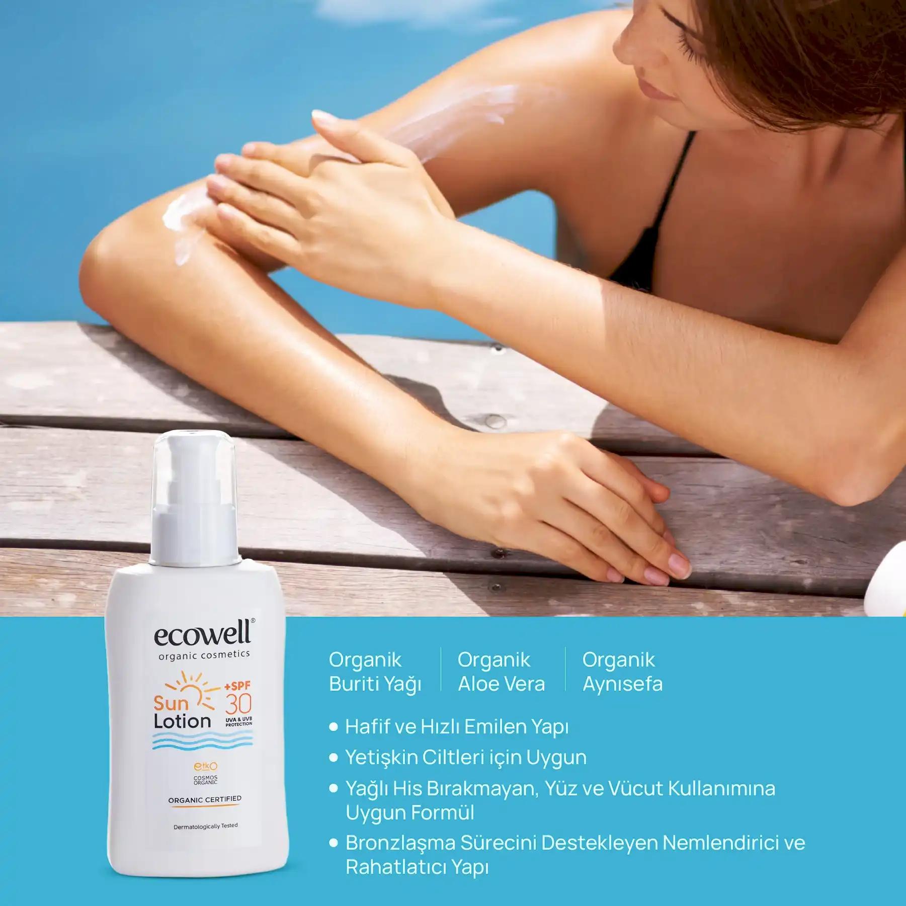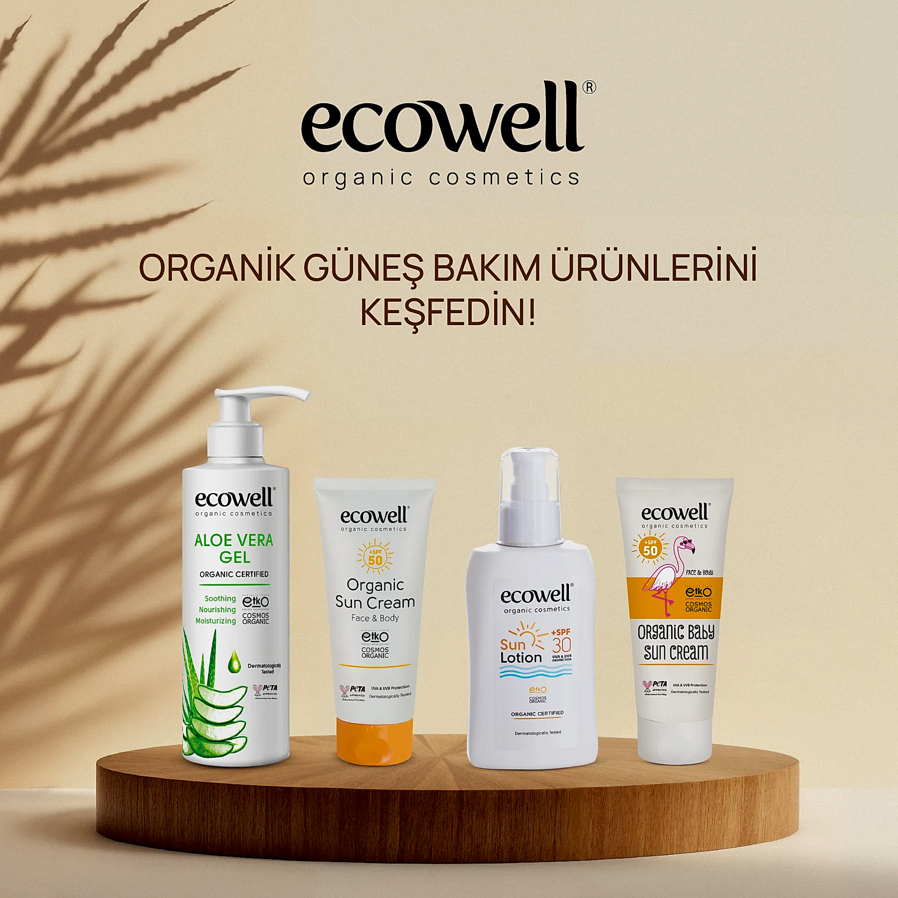 Ecowell Organik Güneş Losyonu Organik Buriti Yağı, Aloe Vera, Aynısefa içeriği ile cildinizi güneş yanıkları, cilt lekeleri ve erken cilt yaşlanması gibi güneşin zararlı etkilerine karşı korunmaya ve sağlıklı bronzlaşmaya yardımcı olur. Cildi nemlendirerek cildin elastikiyetini artırır. Yumuşak krem dokusu sayesinde oldukça kolayca uygulanır.