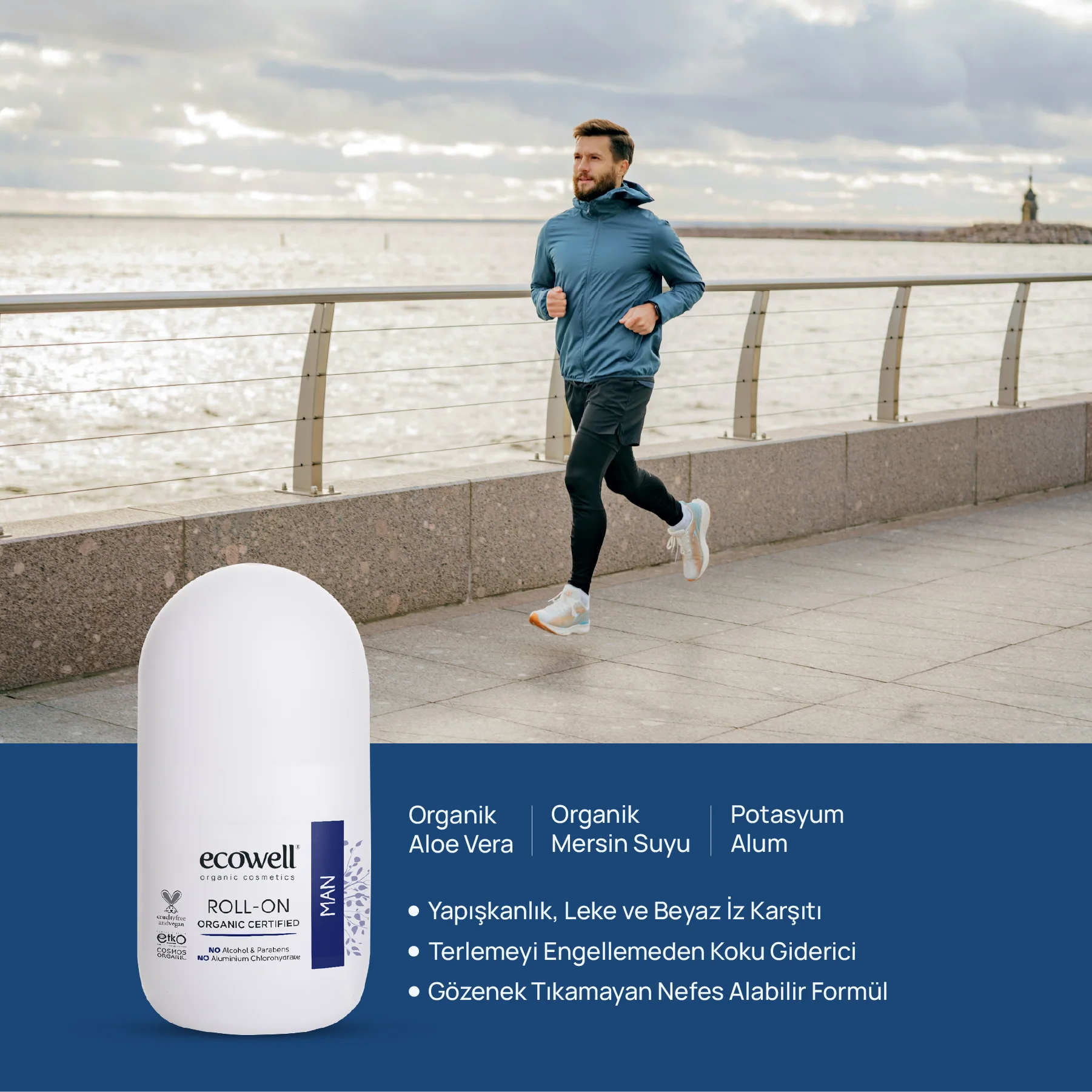 Ecowell Organik Roll-On organik sertifikalı formülüyle kötü kokulara neden olan bakterilere karşı görünmez bir bariyer oluşturur. Organik Mersin Suyu, Aloe Vera ve doğal mineral tuz Potasyum Alum içeriğiyle gözenekleri tıkamadan cildin nefes almasını sağlar. Terlemeyi engellemeden kötü kokuları giderir, cildiniz nefes almaya devam eder. Yapışkan hissiyat, leke ve beyaz kalıntı bırakmaz. Kalıcı kokusu ile gün boyu etkisini korur.