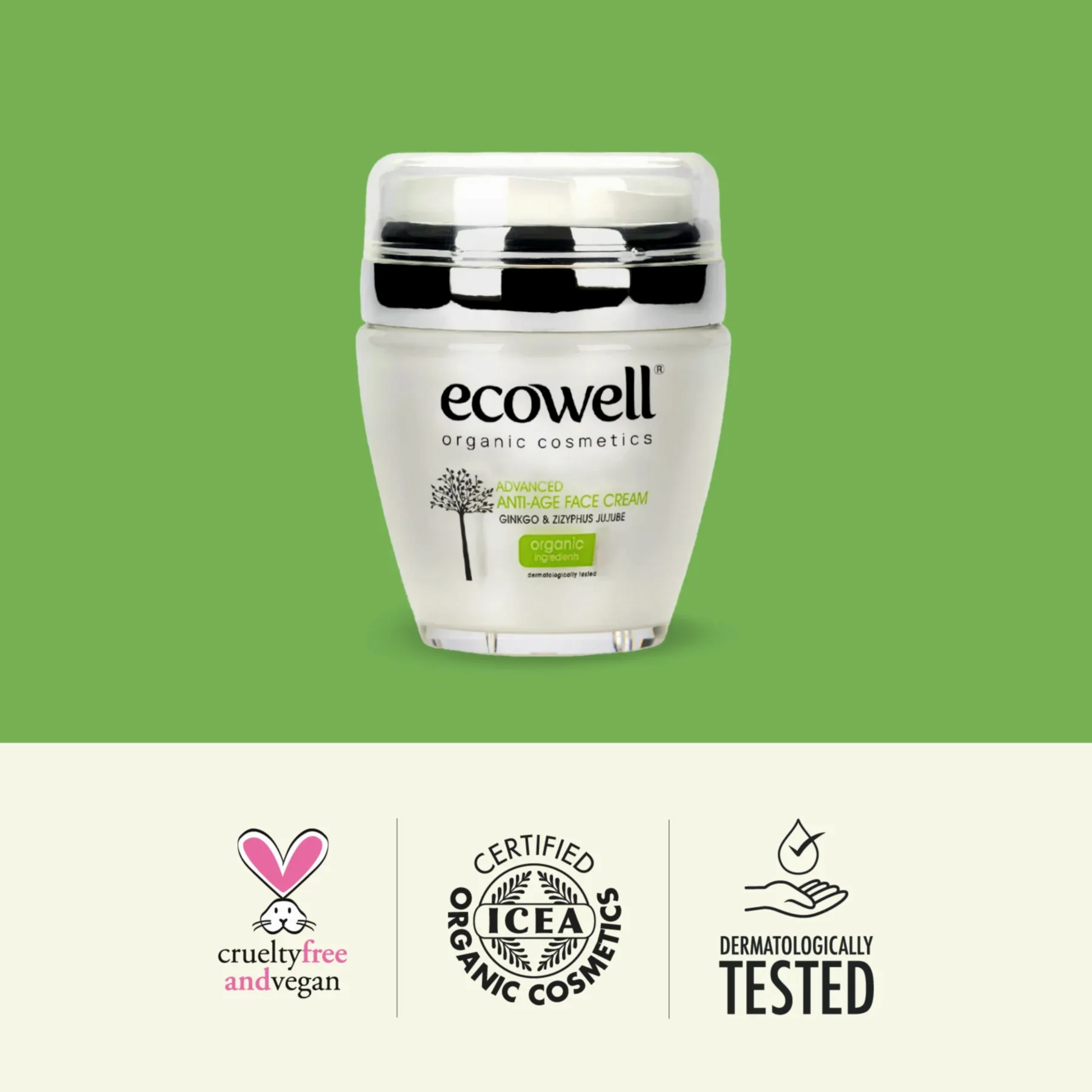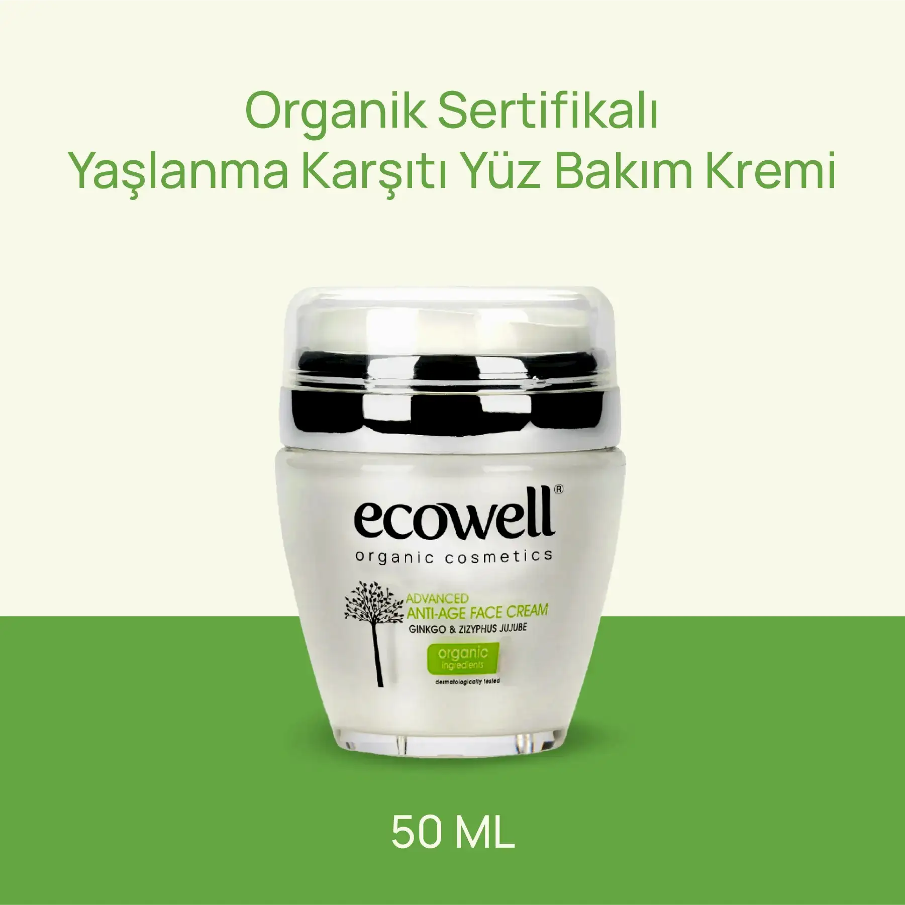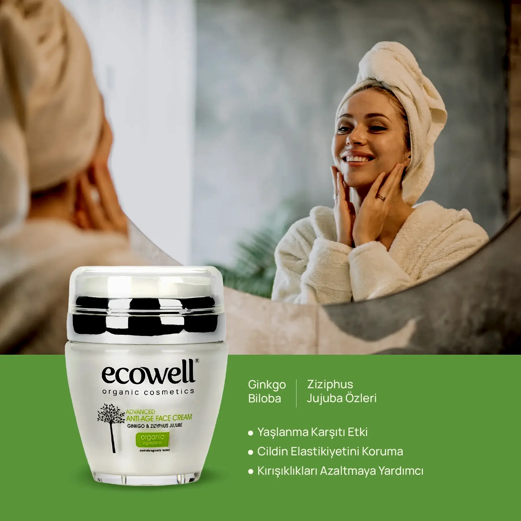 Ecowell Organik Yaşlanma Karşıtı Yüz Bakım Kremi ciltteki yaşlanma belirtilerini göze çarpan bir şekilde azaltmaya yardımcı olur. Aynı zamanda kırışıklıklardan kurtulmak için de etkilidir. Cildi düzgün, taze ve parlak yapar. Cildi sıkılaştırmaya, esnekliğini artırmaya yardımcı olur ve parlak bir görünüm kazandırır. Ginko Biloba özü içeriği ile güçlü bir antioksidandır. Cildi yaşlanmaya karşı korumaya yardımcı olur. E Vitamini kuvvetli bir antioksidandır ve cildi korur. Levan, Zizyphus Jujuba Özü cildin nemi daha çabuk emmesini sağlayarak cildin yapısını korur ve esnek kalmasını sağlar.